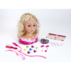 Willkommen im Schmink-Salon für kleine Style-Prinzessinnen! Hier können junge Visagisten mit der bunten Schminkpalette wunderschöne Make-Up-Kreationen zaubern – und das alles mit hautverträglichen Farben. Der Schminkkopf mit seinen hochwertigen, blonden Haaren inklusive zart bunter Strähnen, lässt sich ganz einfach mit Haargummis, Haarklips, Klammern und einer Bürste stylen. Ob romantische Locken, elegante Hochsteckfrisur oder wilde Zöpfe – in den königlichen Gemächern ist alles erlaubt. Das Highlight sind die bunten Edelstein-Pins zum Verzieren, die mit der transparenten Glitzer Tiara um die Wette funkeln. Jetzt noch die passenden Ohrringe, um das Styling zu vollenden und unsere Prinzessin ist bereit für den großen Auftritt.